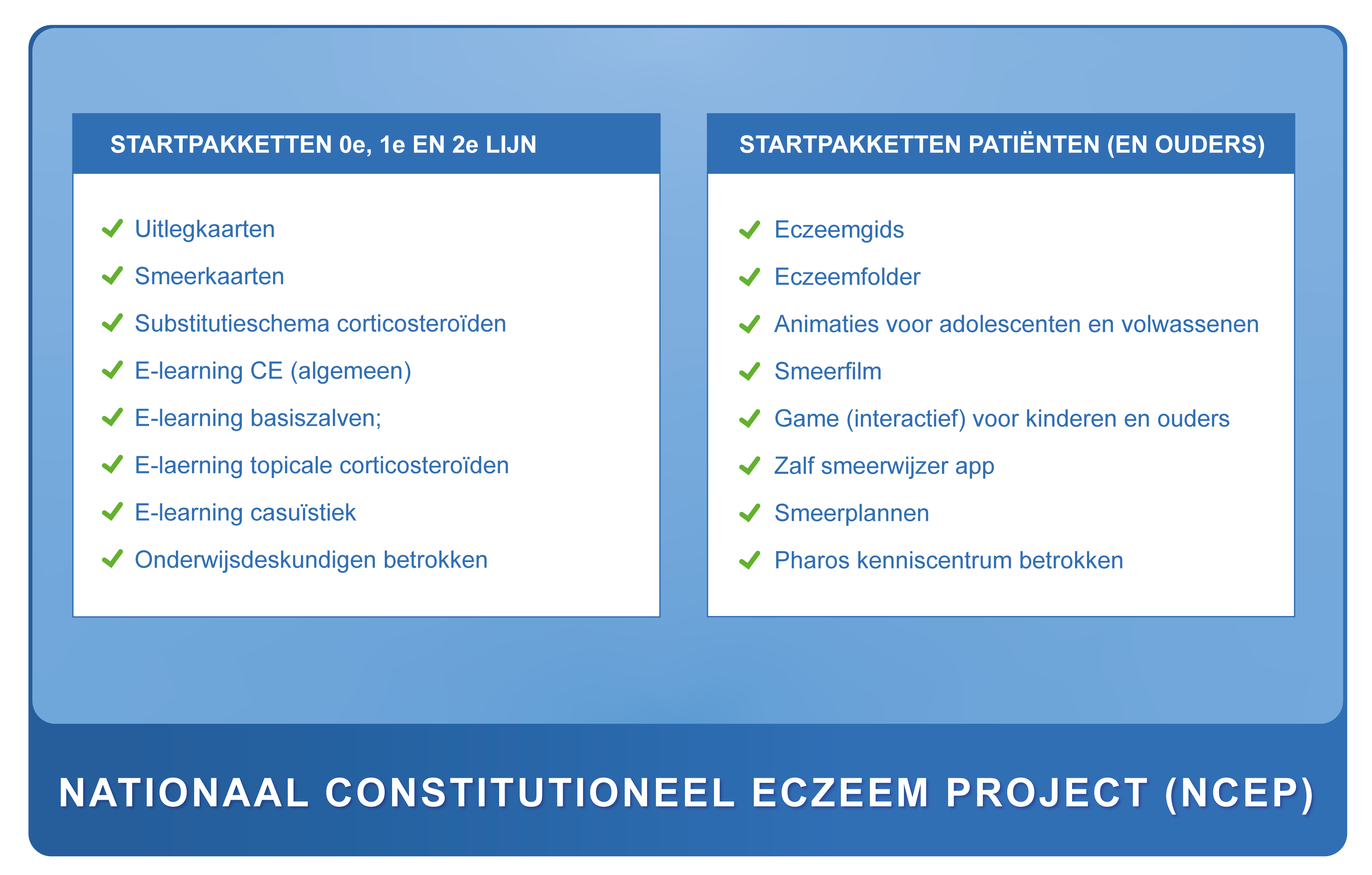 Behandeling vergt een gepersonaliseerde en complexe vorm van zelfmanagement, vooral door het dagelijks toepassen van diverse zalven en het vermijden van uitlokkende factoren (triggers). Hoewel daarin wel overeenkomsten zijn, blijken triggers en ook de verdraagzaamheid en werkzaamheid van zalftherapie, erg persoonlijk te zijn. Voor zelfmanagement zijn kennis over het ziektebeeld en begeleiding bij de behandeling van groot belang. Met het NCEP hopen wij patiënten en zorgverleners hierbij te ondersteunen.